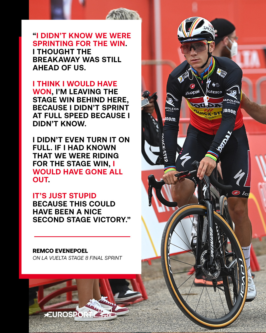 "Le tenant du titre a ensuite été interrogé sur Sepp Kuss (Jumbo-Visma), maillot rouge, qui possède 2'31" d’avance sur lui. "Il est peut être devenu leur leader mais je pense que, lors du contre-la-montre de mardi, je peux récupérer une ou deux minutes sur lui", a-t-il avancé, ne semblant pas inquiété outre mesure."