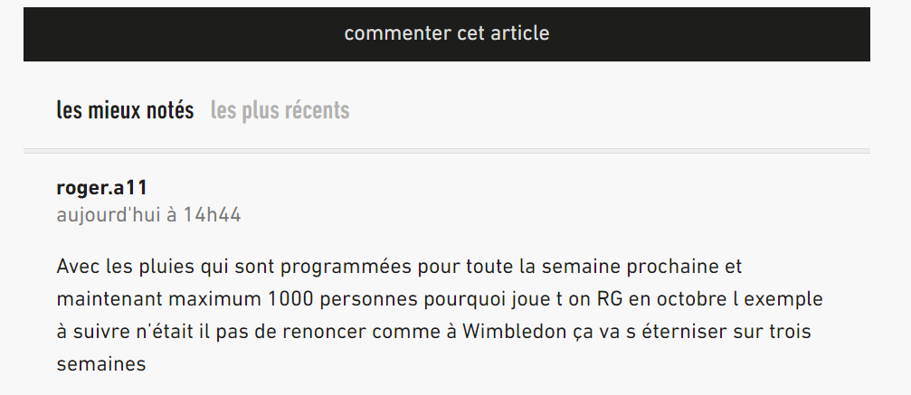 Avec les pluies qui sont programmées pour toute la semaine prochaine et maintenant maximum 1000 personnes pourquoi joue t on RG en octobre l exemple à suivre n’était il pas de renoncer comme à Wimbledon ça va s éterniser sur trois semaines
