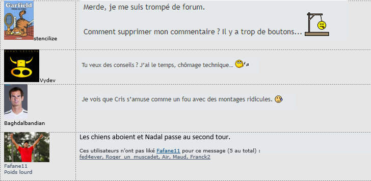 Grosso modo, l'ordre a été été établi selon le nombre de posts (sauf Fed4, j'avais commencé mon tableau par lui). :ooo: