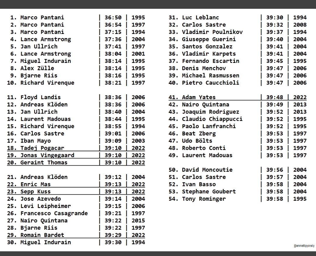 La derniere ascension devrait etre bouclee en environ 38'30 (Record Pantani 1995: 36'40 )