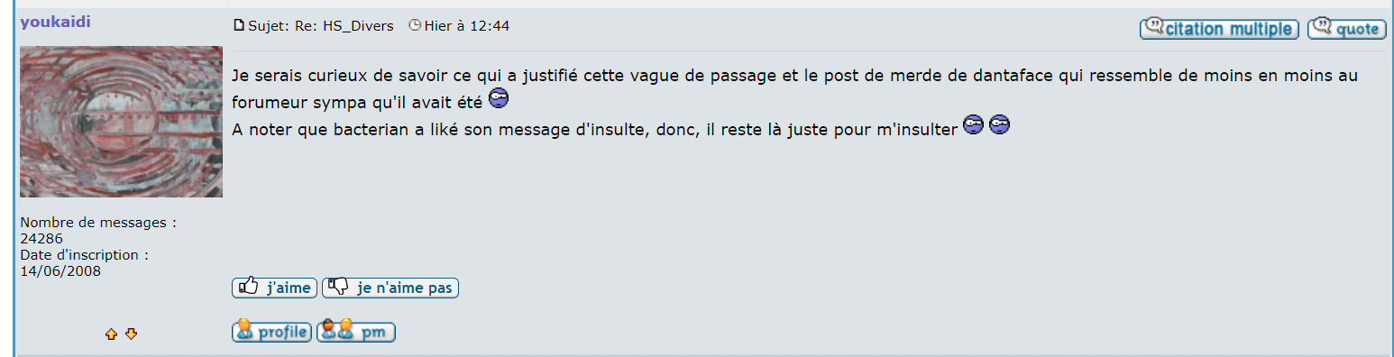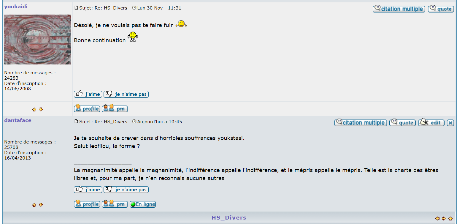 Je suis allé sur 2 topics au hasard et ya que leo qui se répond à lui-même, on dirait un asile.