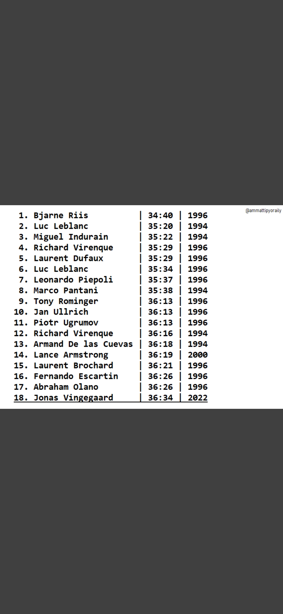 17. 1996: 36:24 Abraham Olano 22.25 km/h