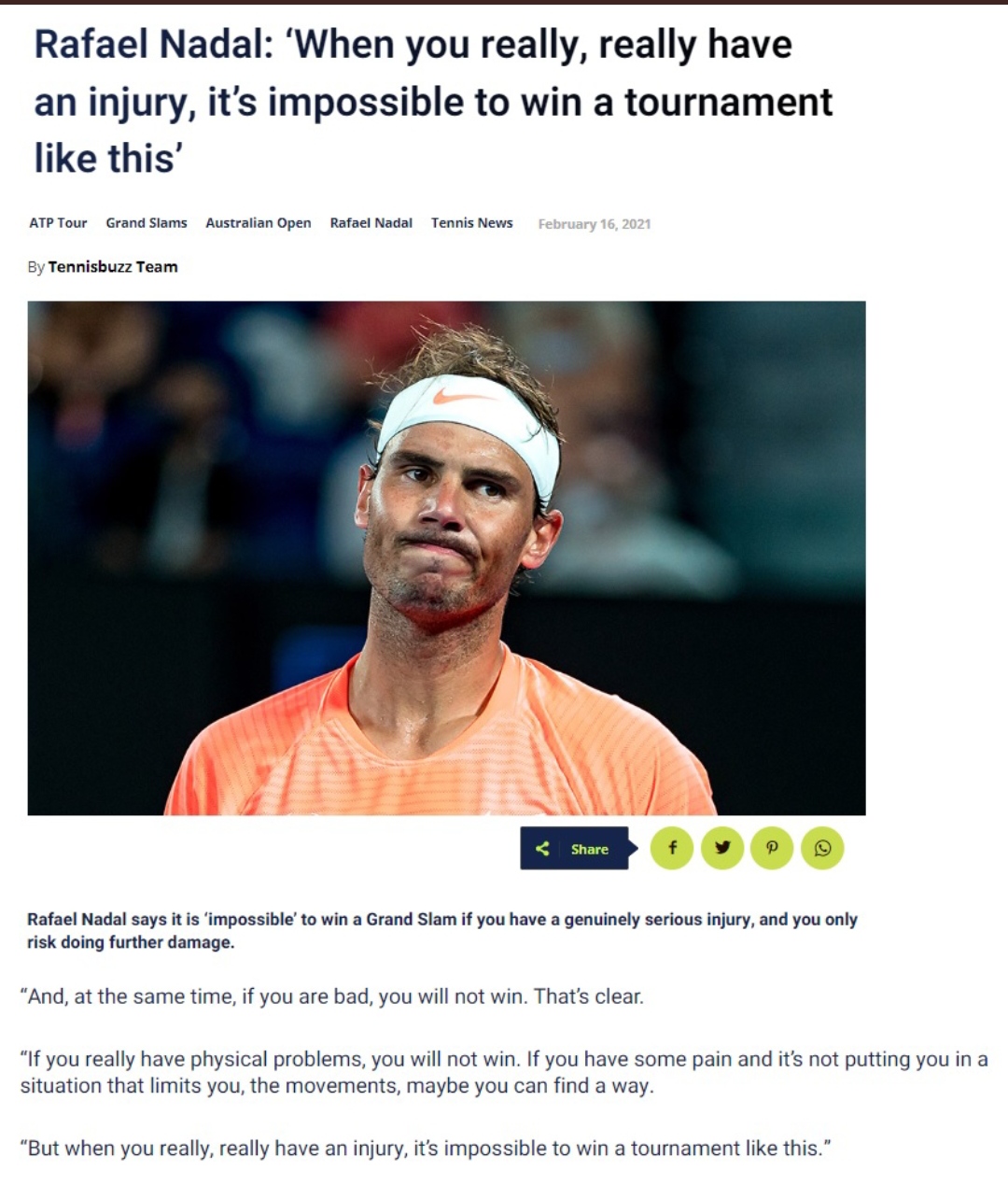 Mais en 2021, face à Novak Djokovic, en demi-finale de Roland-Garros, la maladie s'est violemment réveillée. Alors qu'il avait déjà renoncé durant cette saison au tournoi de Wimbledon et aux Jeux olympiques de Tokyo, il a dû déclarer forfait à l'US Open et annoncer qu'il ne participerait pas à d'autres compétitions. "Honnêtement, je souffre beaucoup plus que je ne devrais avec mon pied et j’ai besoin de prendre un peu de temps", avait-il justifié sur son compte Twitter, en août de l'année dernière.